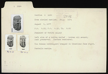 | Description: | Left side of a votive relief. Broken all around; back preserved. Surface weathered. Two female worshippers wrapped in himations face right. Pentelic marble. | |