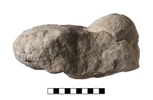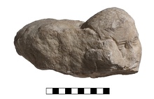 | Description: | Broken on sides, top and bottom. Fragment of relief depicting head of woman in profile, turned left and slightly downward. A small part of the background, to which the face is attached, is preserved, with a shallow groove (drill channel) cut between face and background. Woman has well modeled cheeks and deep set eyes. Top of head worn. Style and inclination of head suggest that this is part of a funerary stele. Second use: stele broken all around head, turned over and on side, so that woman's left cheek became the top surface; piece recut as support for statue. Part of tree-trunk is rendered, with a bunch of grapes hanging along it. In second use, piece was made for practice only, or left unfinished. White marble. | |
