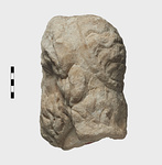 | Description: | Battered bearded male head, broken at neck. Long hair held in place by circular fillet on back of head; part of second fillet preserved on forehead. Just below head, drill marks clearly visible on hair and head. Placement and carving of eyes asymmetrical; seems to be looking up. Nose and mustache battered. Hair on top and back of head extending down to break. Shallowly carved and fairly flat. White marble. | |
