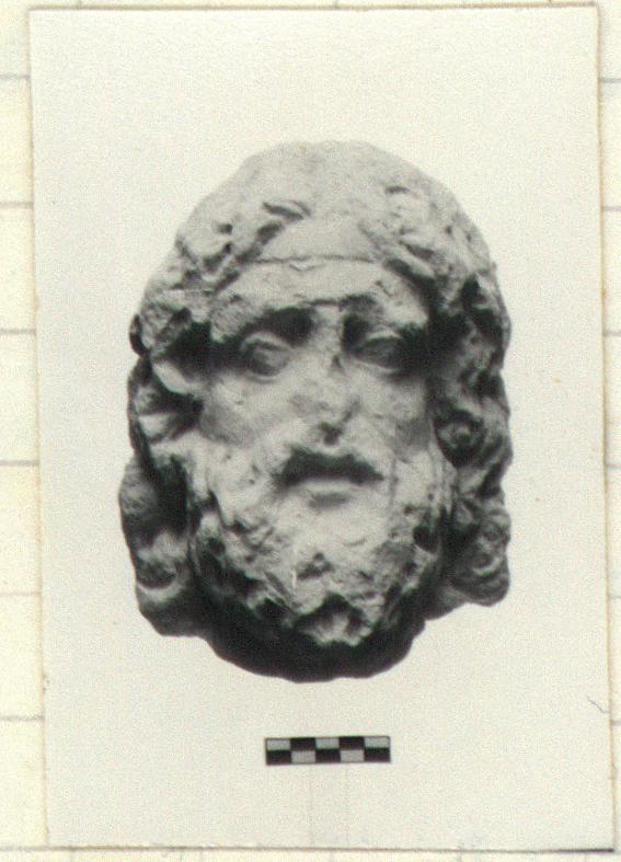 | Description: | Battered bearded male head, broken at neck. Long hair held in place by circular fillet on back of head; part of second fillet preserved on forehead. Just below head, drill marks clearly visible on hair and head. Placement and carving of eyes asymmetrical; seems to be looking up. Nose and mustache battered. Hair on top and back of head extending down to break. Shallowly carved and fairly flat. White marble. | |