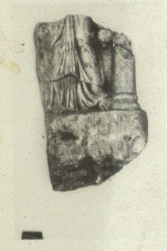 | Description: | a) Broken at top and bottom; left side partly gone. Rough-picked on back and sides. The lower part of a draped woman is represented, from slightly above the knees and down. She wears chiton and himation and stands with her left knee bent and her weight on her right leg. Her left foot rests against a small column with Ionic base (Attic), and she holds some object in her left hand, probably a pail or situla. Nearly half of the preserved height of the stone is taken up with a broad band at the base of the scene. b) Two more fragments (N 368) join to the left, giving the full width of the monument. Near the bottom rough surface projects at the sides for setting. The lower part of a second figure is preserved, a youth, facing, wearing an exomis (?). A small column frames the scene at the left as at the right. Indifferent work. This block served as a threshold of the pottery kiln described in notebook, section N, pp. 792 ff. The bottom surface has been burned away, and the back is blackened. Pentelic marble. | |