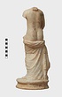The woman's weight is on her right leg, so that her body has a pronounced curve to the right. The upper part of her body is nude. She holds her drapery (with her right hand) so arranged that the rolled fold below her thighs falls between her knees straight to the ground. Four vertical locks of hair lie on the back of her neck. At her right a dolphin posed on its head served as a strut. It is cut all of a piece with her drapery. A strut still remains as well below the right elbow of the Aphrodite. The base is approximately Ionic: the torus at the top projects too far for perfect proportion.