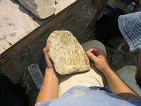 Description:   Proper right corner of a relief broken all around. Some of the back possibly preserved: faint traces of a picked surface. Badly worn and flaking, outline of figure visible only.