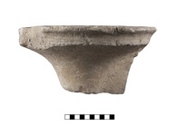 Flaring mouth with outturned rim offset by ridge. Top surface flat with tool marks and a dowel hole. Triangular flat projection (handle) starting just under the ridge, broken at bottom. Exterior face of projection ribbed vertically.