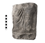 | Description: | Broken border. Surface very weathered, dark staining. Standing female figure wearing chiton and himation, preserved from the thighs down, turned toward the left, weight on left leg, right leg relaxed. White fine-grained marble. | |
