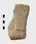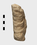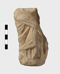 | Description: | Broken at waist and proper left side. Large chip on drapery in front. Back quite worn and flattish (intentionaly?) with some traces of features: large cloak over peplos. Standing female figure with left knee forward. Drapery covers lowest part of body, upper part seems to be naked. Base roughly worked (reuse?) and slightly rounded making the statuette unstable. White marble. From a plinth? | |