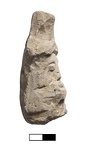 | Description: | Definitely broken below. Clear lines hacked at the back at the level of the bottom of the peaked cap. Rough mask like face, with high peak on his head. Unfinished. Soft greenish yellow poros with holes. | |