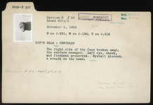 | Description: | The proper left side of the face is split off, its surface damaged. Right eye, cheek and forehead preserved. Eyeball pierced. A wreath on his head. Pentelic marble. Drilled for setting on base in June 1950. | |