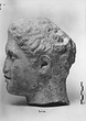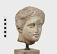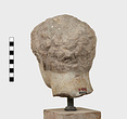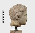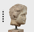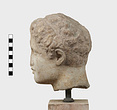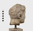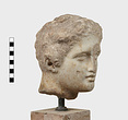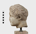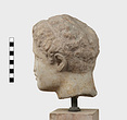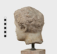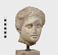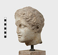 | Description: | Broken off at the neck; the nose broken, and a piece missing from the top of the head; otherwise well preserved, save for a few chips, and the remains of cement from the wall. Modern dowel hole in neck: cf. S 473. The head, slightly under life-size, is tipped slightly to the figure's right. The hair, worn in short curls brushed back from the brow, seems to have been held in place by a fillet of another material; a groove for this fillet, but no trace of metal, remains. The surface of the hair is left very rough, as if for color; the flesh is carefully polished. Although in scale and in style this head corresponds very closely to the statue S 473 (Β 571), near which it was found, there is no direct join, and the neck muscles make it seem unlikely that statue and head belong together. For a temporary union, see large photo, pl. no. 4-179. Pentelic marble. | |