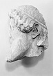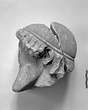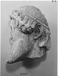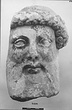 | Description: | Broken away diagonally from the back of the head to the right side of the face. The right ear and curls around the right cheek missing. The nose, left eye and end of beard chipped. Part of the neck on the left side preserved. The fine-combed hair is bound by a fillet, below which snail-shell curls frame the brow. Probably from a herm. Careful archaistic work. Pentelic marble. Joins S 1083 (Ν 179). | |