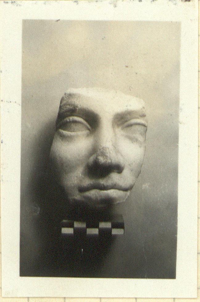 | Description: | The face, about life-size, is preserved, the chin missing and the cheeks broken away. The top of the head has its original surface, a smooth-finished one across its front, with rough-picked surface behind. This top surface forms an obtuse angle with the brow. Carefully worked to a smooth-polished finish. Island (?) marble. Cf. S 553 (Ν 263), S 554 (Ν 264), S 558 (Ο 590), S 1213 (ΩΔ 218) and S 1391 (ΣΑ 327). ADDENDA Published as made of Pentelic marble. | |