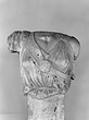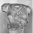 She wears a chiton gathered in about the waist with a belt of two strands. At the sides it is pulled out and hangs down over the belt. It is very sketchily shown on the back. The end of the himation, which was probably thrown around the lower part of the body, falls in heavy folds over her right shoulder. Between the shoulders are traces of hair or helmet.