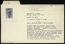 | Description: | A small bearded head in archaic style. Nose broken, the break worn smooth; beard somewhat damaged. Detail in general rubbed rather smooth. Hair worn in curls across forehead, otherwise apparently left smooth. Eyes bulging, lids separated from ball by shallow groove. Mouth straight with drooping mustache. A double drilled hole in bottom of neck for attachment. Perhaps not original (?), for neck appears to be broken below. White marble. | |