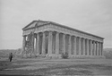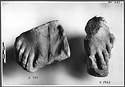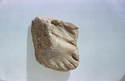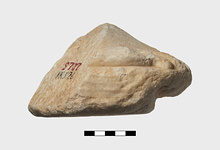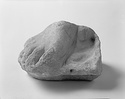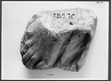 | Description: | Much weathered. Rough-picked beneath, with surface cut off by drill holes. Broken at back. A female right foot, with drapery hanging down beside it. Possibly a pedimental piece from the Temple of Hephaistos. Parian marble. | |