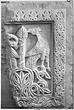 Description:   A rectangular panel with heraldic design in low relief; the left side broken away.