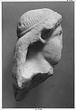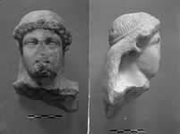 Description:   Head and very upper part of pillar preserved, including part of the rectangular cutting for left arm stub. Nose, mouth and chin damaged. Beardless, rather full face. Double row of curls across forehead, above which a fillet is bound. Hair, wavy on top, falls down behind in a broad wavy mass. Rather large hole in top of head.