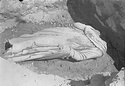 | Description: | Head missing (a separate piece set in socket); left hand, right arm from elbow, most of both legs below knees broken off; all of animal on proper left side, except wing, missing. A life-size draped male figure, left hand resting on lap, right arm stretched out or up; sitting on a throne consisting of a rectangular solid block, slightly rounded at back; front ornamented on either side with heraldic beasts (broad wings, tiger's heads with droopy tongues, rams' horns). On top of throne, in back, two rectangular dowel holes (for a back rest?), back of figure slightly dressed down. Pentelic marble. Cf. S 826 (Σ 1260). | |