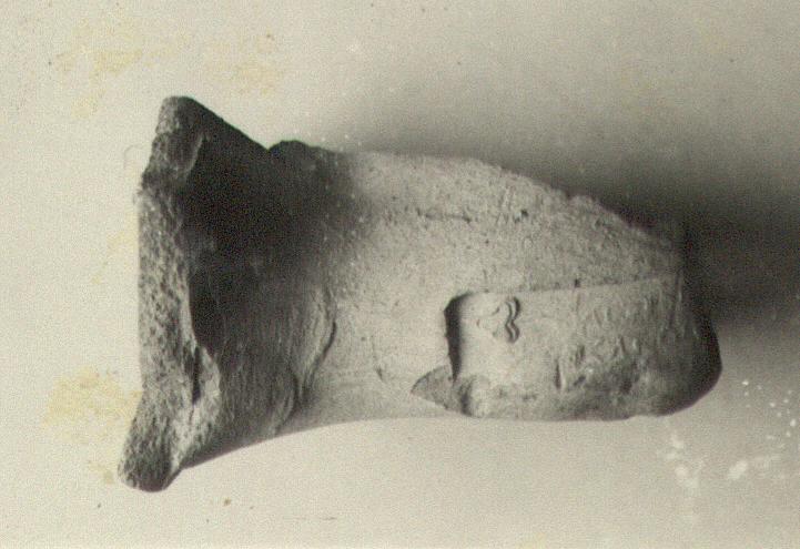 | Description: | Rather thick handle. Impression incomplete above, broken away to left; worn. Ivy leaf. | |