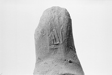 | Description: | Smallish broad handle with short slightly arched upper part. Coarse bright red clay, grey-buff at core. Shallow impression incomplete and worn to right; appears to be from same die as SS 178 and perhaps SS 813, representing in crude form the prow of a ship right. This seal is the only one preserving the left end. | |