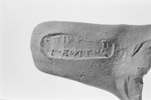 | Description: | Broad, level; curves like Knidian. Coarse red clay, smnall grey core; slightly micaceous. Impression set obliquely; incomplete above, right. | |
