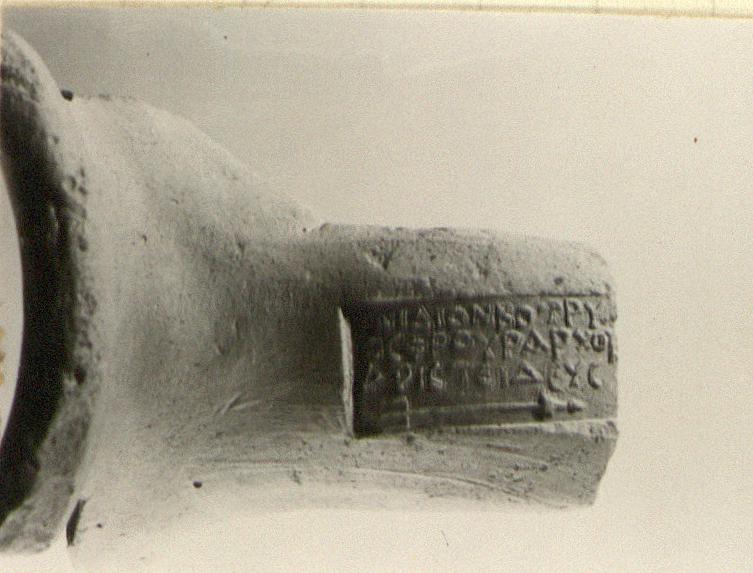 | Writing: | Κνίδιον Βότρυ ος φρουράρχου Ἀριστείδευς trident l. w/ grip? (Ε,Σ lunate, Α broken-barred) | |