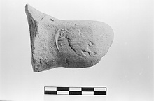 | Description: | Fragment of upper part of amphora handle, broken ar body and at one end. Reddish clay. Stamp has forepart of a lion within circle, preserving part of letters. | |