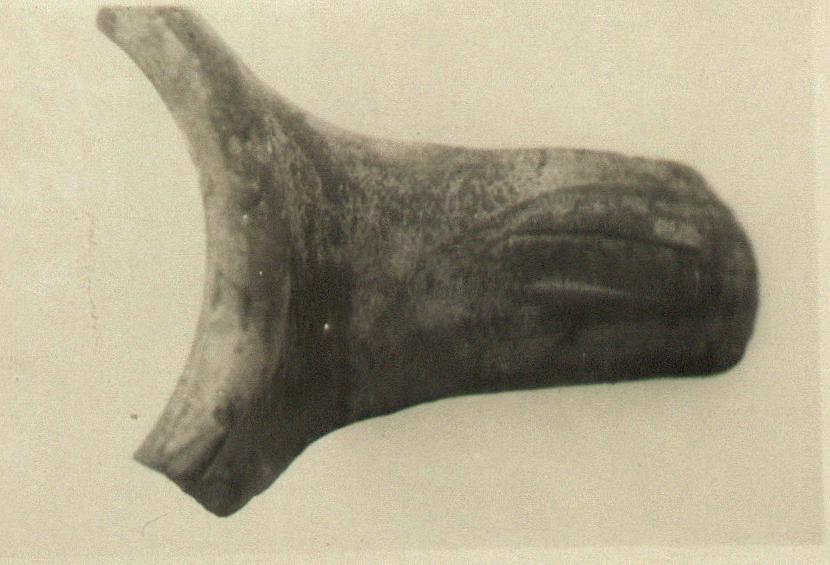 | Description: | Broad, ribbed, slightly descending; handles drop from attachment. Coarse greyish-red clay, yellow at surface; somewhat micaceous; traces of light slip. Narrow rectangular impression set a little obliquely. Letters practically obliterated. | |