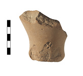 | Description: | Complete toe with small portion of lower wall. Resting surface of toe heavily chipped on one side. Tubular hollow toe. Slightly flaring lower wall. Roughly rounded stamp with Χ in relief. Coarse micaceous red brown clay fired grayish at core. | |