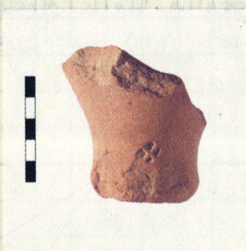 | Description: | Complete toe with small portion of lower wall. Resting surface of toe heavily chipped on one side. Tubular hollow toe. Slightly flaring lower wall. Roughly rounded stamp with Χ in relief. Coarse micaceous red brown clay fired grayish at core. | |