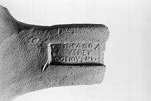 | Description: | Broad, level; broken before curve. Coarse red clay; grey at core; traces of light slip. Impression set very deep; right end broken away. | |