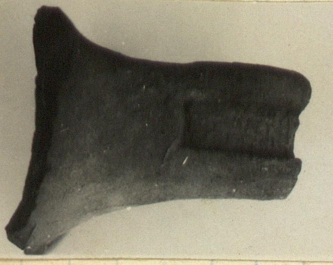 | Description: | Broad, level; broken before curve. Coarse red clay; grey at core; traces of light slip. Impression set very deep; right end broken away. | |
