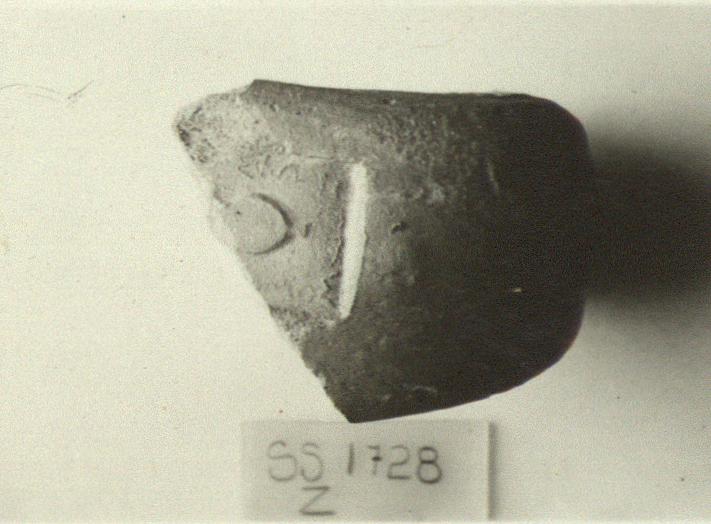 | Description: | Curve fragment. Russet clay with large red core. Lower left part of impression broken away; vase, small foot right. Similar devices on Pridik (1917), pl. III. | |