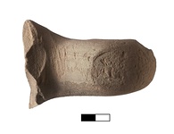 | Description: | High rising, thick. Fairly fine clay; reddish-buff with small red core; traces of cream slip, surface being reddish and pitted where slip is missing. Impression shallow set, much damaged; circular stamp with rose. | |