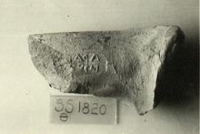 | Description: | Slim handle. Coarse red clay; slip thick on top. Impression broken away at left. Same die as SS 210; restored from that. | |