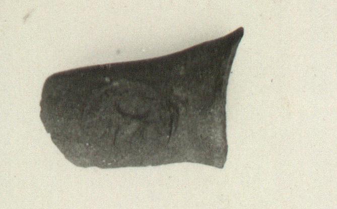 | Description: | Broad; ribbed; broken at curve, neck not preserved. Coarse clay; greyish-red, brick red at surface; traces of light slip. Sharp impression, well preserved, incomplete small part of circumference under boukranion. | |