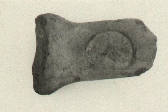 | Description: | Level, slightly twisted; broad, ribbed, broken at curve. Coarse red clay, grfey at core, yellow at surface; light slip. Impression incomplete about one-third of circumference; most of the letters practically effaced. | |