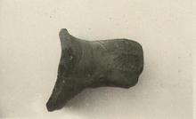 | Description: | Broken before curve; ribbed; broad, narrowing to junction with neck from which it rises. Inside neck, hollow where thumb was impressed in attaching handle. Coarse greyish-red clay, full of large bits. Left end of the impression incomplete; sharp. | |