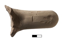 | Description: | Thick, rising, broken at curve; somewhat twisted. Similar clay to typical Rhodian. Impression much chipped round right end; worn in middle. | |