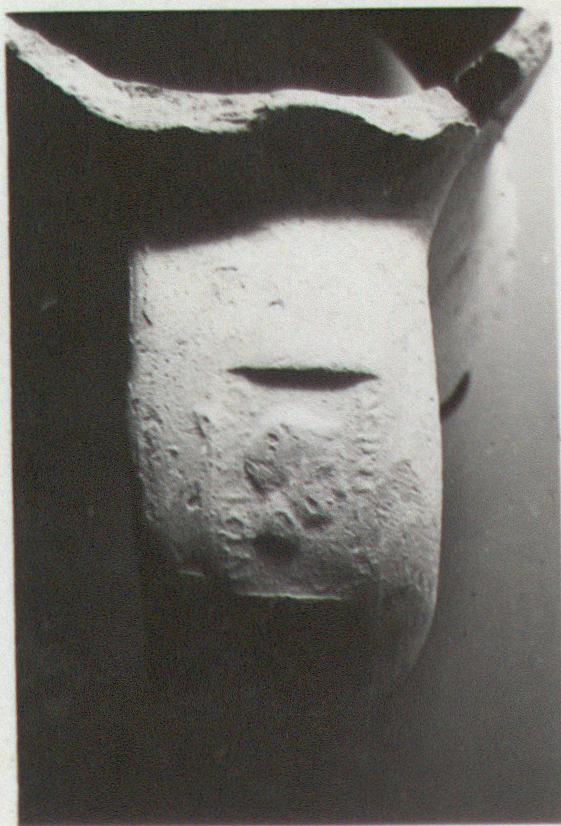 | Description: | Neck and shoulder of amphora mended from many pieces; opne fragment does not join; part of the rounded lip and one handle, unstamped, complete. Light red clay, pale grey core; buff slip. The stamp on the fragmentary handle, well above the curve. Male head right. On the neck, a dipinto. | |