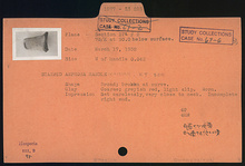 | Description: | Broad; broken at curve. Coarse greyish-red clay, light slip. Worn. Impression set carelessly, very close to neck. Incomplete right end. | |