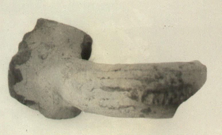 | Description: | Lower attachment preserved with upswinging curve. Red clay with cream slip. Sharp impression, incomplete lower right. | |