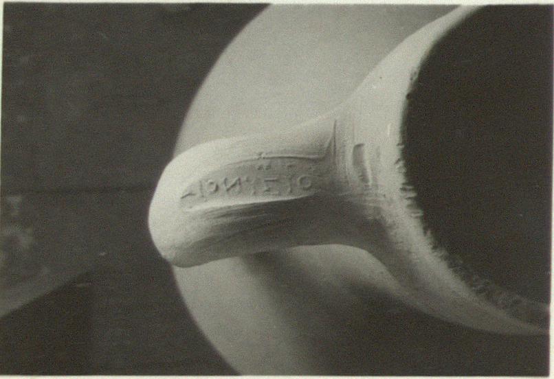 | Description: | Complete and entire save for a puncture in the side; groove ca. 0.07m. long, 0.05m. below rim; tip extends 0.05m. below ring. Shape similar to SS 3213. Capacity (corrected from 29.875 wheat, VG 1939) 30.500; Capacity (mbw) 30.880. Coarse red clay, fired pale yellow on the outside. Both handles bear the same stamp. Cf. Dumont (1872), p. 179, no. 229. | |