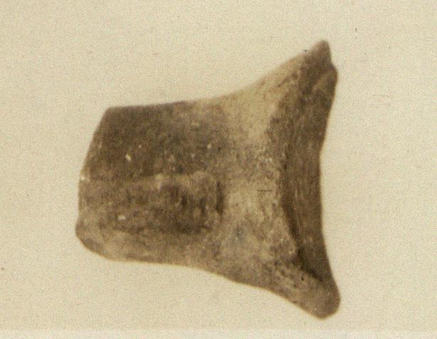 | Description: | Typical shape; broken before curve. Typical clay; darkened slip. Left end of the impression broken away; shallow; chip out of middle. | |