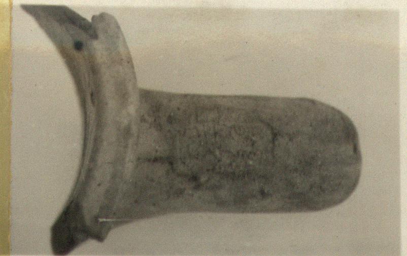 | Description: | Typical shape; high rising; part of rim preserved. Typical clay. Short rectangle impression, set close to neck; less neat than typical Rhodian. Same pot as SS 00334 (?). | |