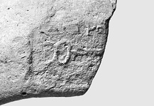 | Description: | Curve fragment. Micaceous brownish-red clay. Stamped on the curve; caduceus. | |