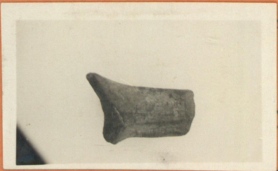 | Description: | Typical shape; broken at curve. Typical clay. Impression incomplete at upper left; worn impression from sharp mould. | |
