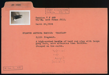 | Description: | Split fragment of high-arched handle. Hard red clay with large grey core, more micaceous than Knidian. Stamped on the curve. | |