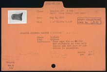 | Description: | Typical shape. Typical clay. Impression set obliquely so that only double axe and part of the bottom is preserved. From same die as SS 353. | |