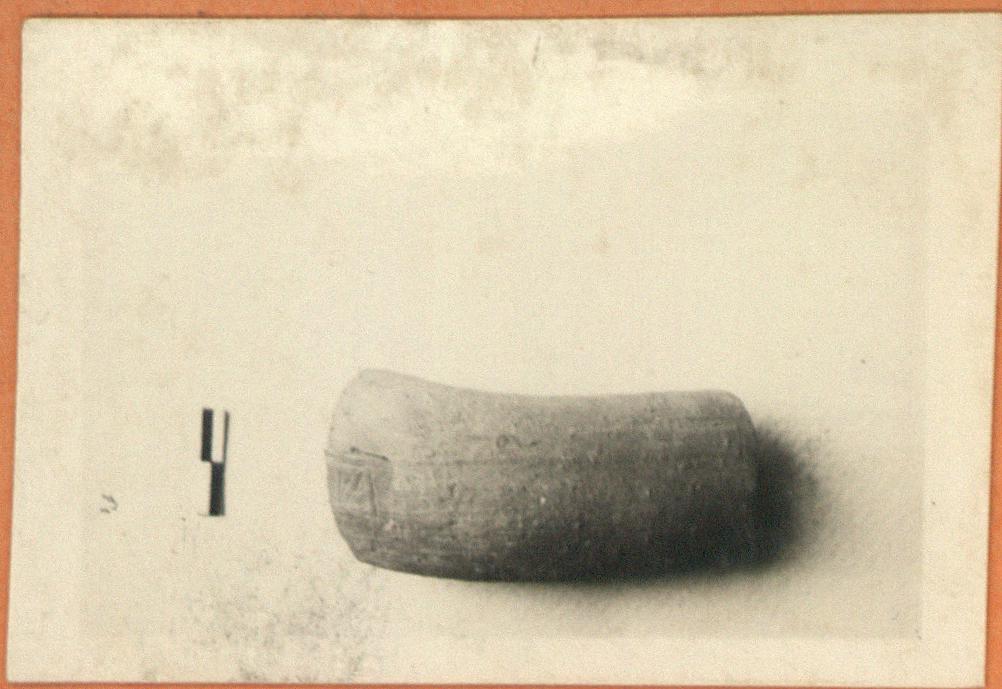 | Description: | Small, thick, nearly cylindrical. Medium fine, red clay; slightly micaceous; pinkish-buff slip. Impression broken away left of two letters. | |