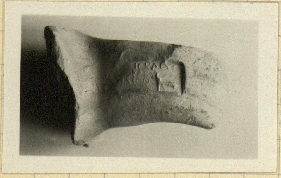 | Description: | Typical handle. Slip thick on top. Impression incomplete to left, erspecially upper part, and below. Handle and central prong of trident appear to border impression below; lower pron g entirely missing. A fault in the die connects the upper prong with the final "C" above it. | |